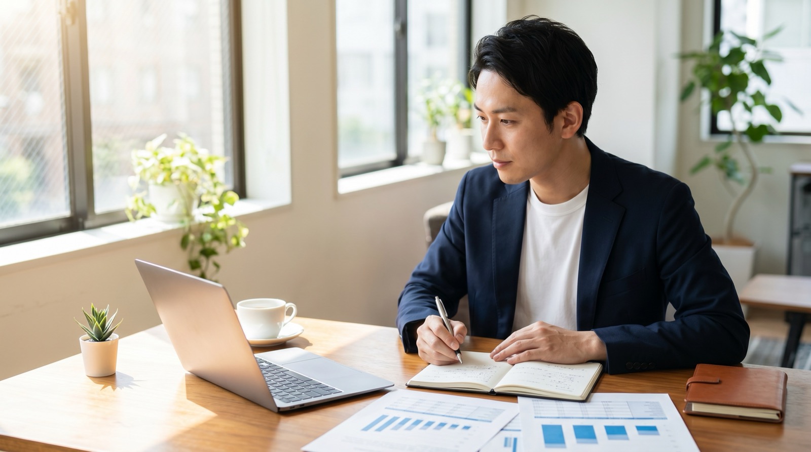 校舎長がデスクで手を止めて考えている場面